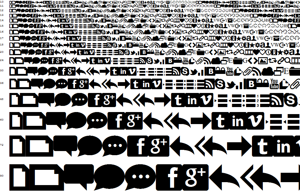 The subset of Web Symbols Regular in this kit includes all the glyphs listed below. Unicode entities are included above each glyph to help you insert individual characters into your layout.